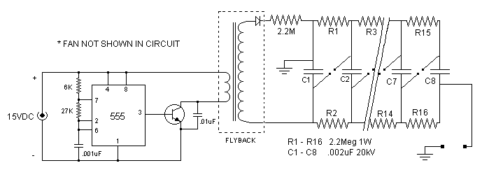 The "quick and dirty" marx generator shown above was rebuilt in a slightly neater manner on a small wooden platform. It now runs off a compact high voltage generator consisting of a 555 timer oscillator that drives a HV transistor that drives a small modern TV flyback capable of providing about 12kV to 20kV. Below is a schematic diagram of the updated marx generator with the new HV generator.