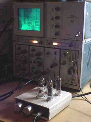In this trace, the probe has been changed to 10x and the scope is still on DC coupling. The 12AU6 amplifier clearly inverted the video by making the sync pulse the highest voltage at around 13V and the video signal in the lower end ranging from 5 to 8 volts. The small gain is sufficient for my Tektronix's Z axis, but rather weak for the oscillators to lock onto the sync so the amplified video is fed into a high gain 12AT7 stage mainly for sync amplification. The intensity Z-axis information still can be retrieved off the plate of this tube if necessary. The following scope trace shows the signal on the plate of V2a.