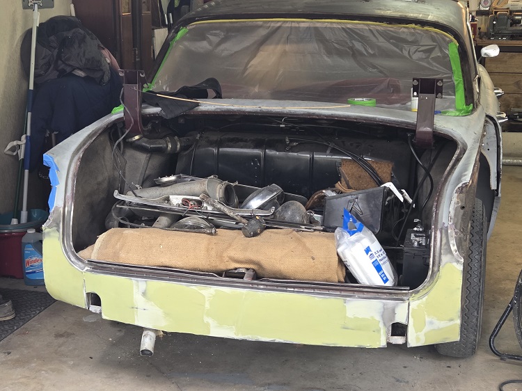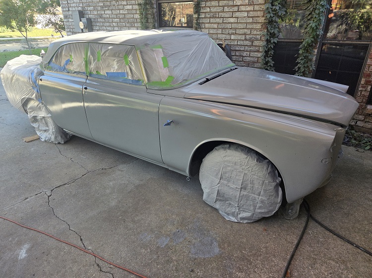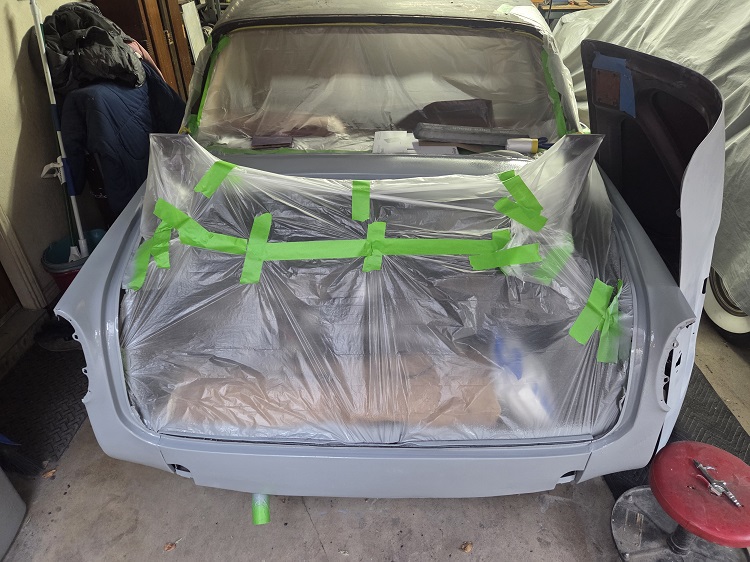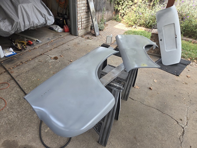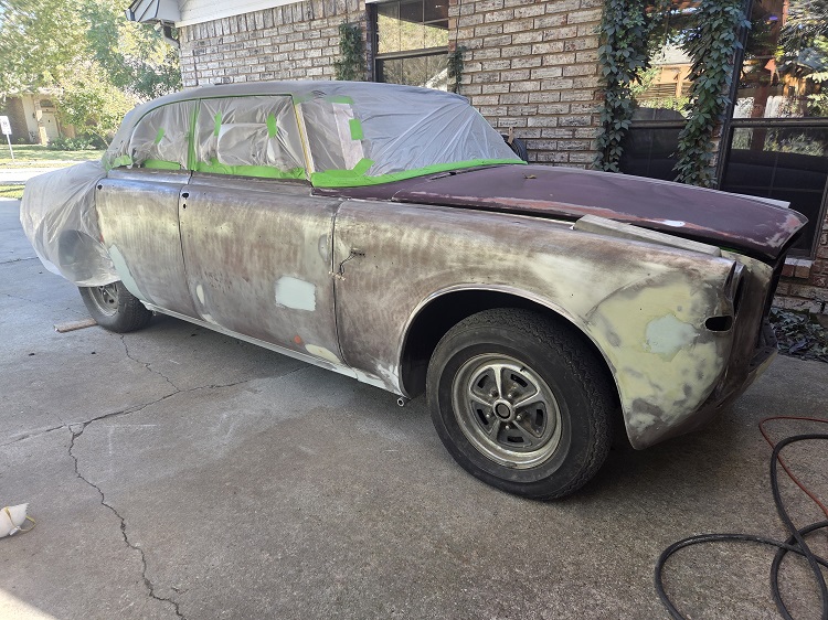 It was finally time to finish the body and paint picking up where the previous owner left off after the rust repairs were completed. I started on the rear first removing the trunk door and rear fenders to assess the state of the paint or primer that they were left in. I saw several rust spots and peels so I decided to play it safe and stripped these three pieces with a wire wheel, wiped clean with wax and grease remover, and then applied epoxy primer/sealer using a HVLP spray gun. There were dents and waves that would require some light body filler and sanding.
