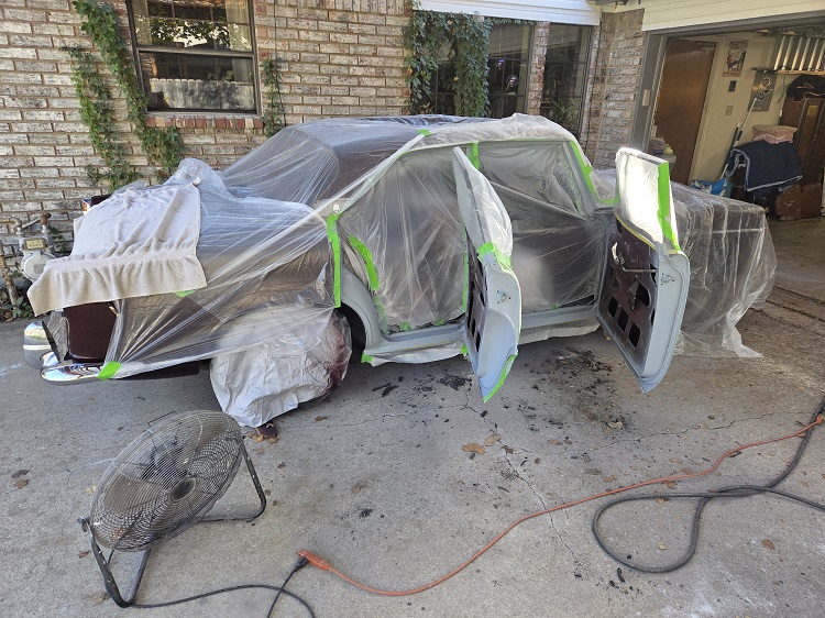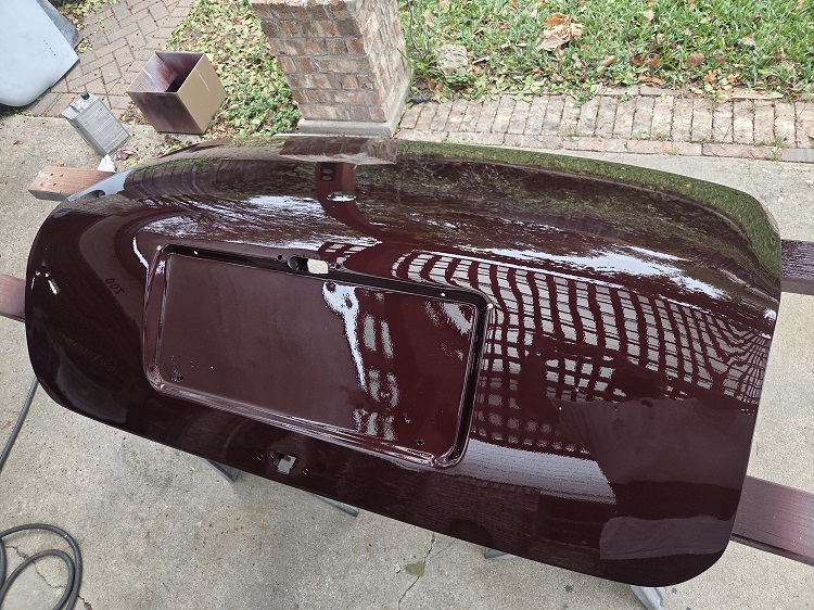 The original Bordeaux Red color code does not have any modern cross references to USA-based paint formulations. There were still portions of the car including the interior of the trunk door that still had the original paint, but I did not like the purple tint. The auto paint store used a camera to computer match to a 1998-99 Toyota 3M6 Burgundy or a late 2000s Chrysler PR8 Deep Molten Red, neither of which I liked because they looked more purple than red. I ended up manually comparing color chips from a 2008 Import paint catalog to the trunk interior and looked up the color online for a reference of how it looked on an entire car. In the end, I chose a 2008 Mercedes Carneolrot Pearl, PPG code 912147, using the two-stage base followed by clear coat. I initially dreaded to do this myself to avoid breaking the bank especially without a paint booth, but I decided after having practiced with painting a few cars up to this point, I was more comfortable with the HVLP gun, air pressure, settings and process. I waited until October-November when the Texas weather was in the perfect 60-70 degree temperature range, no rain and minimal dust/pollen issues to paint outside. The trunk was the first piece to be painted.