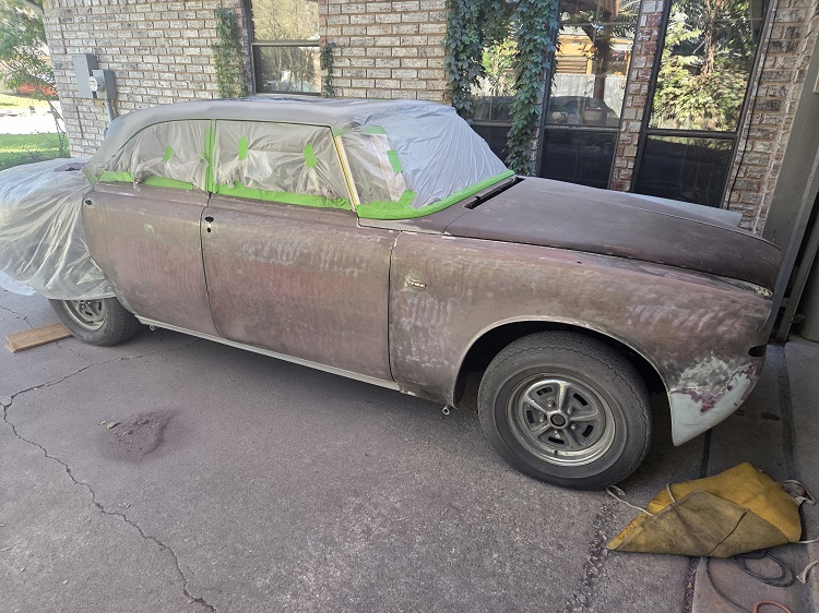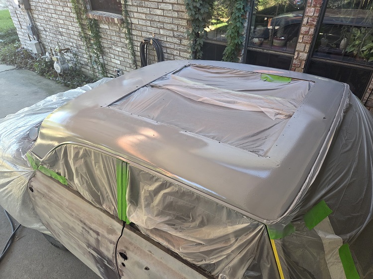 I removed the Webaso-like Wilsons brand Weathershield vinyl sunroof before masking off. There were stress cracks in the sheet metal on the corners that needed to be welded prior to paint. The roof still had the original paint and it appeared to be in good condition without cracks or peels to primer over.