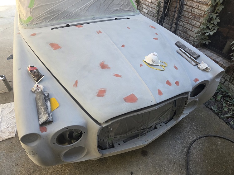After applying the epoxy primer/sealer over the old paint or bare metal panels, 2K primer was applied and sanded like described earlier. The guide coat helped identify numerous light dents and waves that needed to be corrected with red bondo glaze putty.